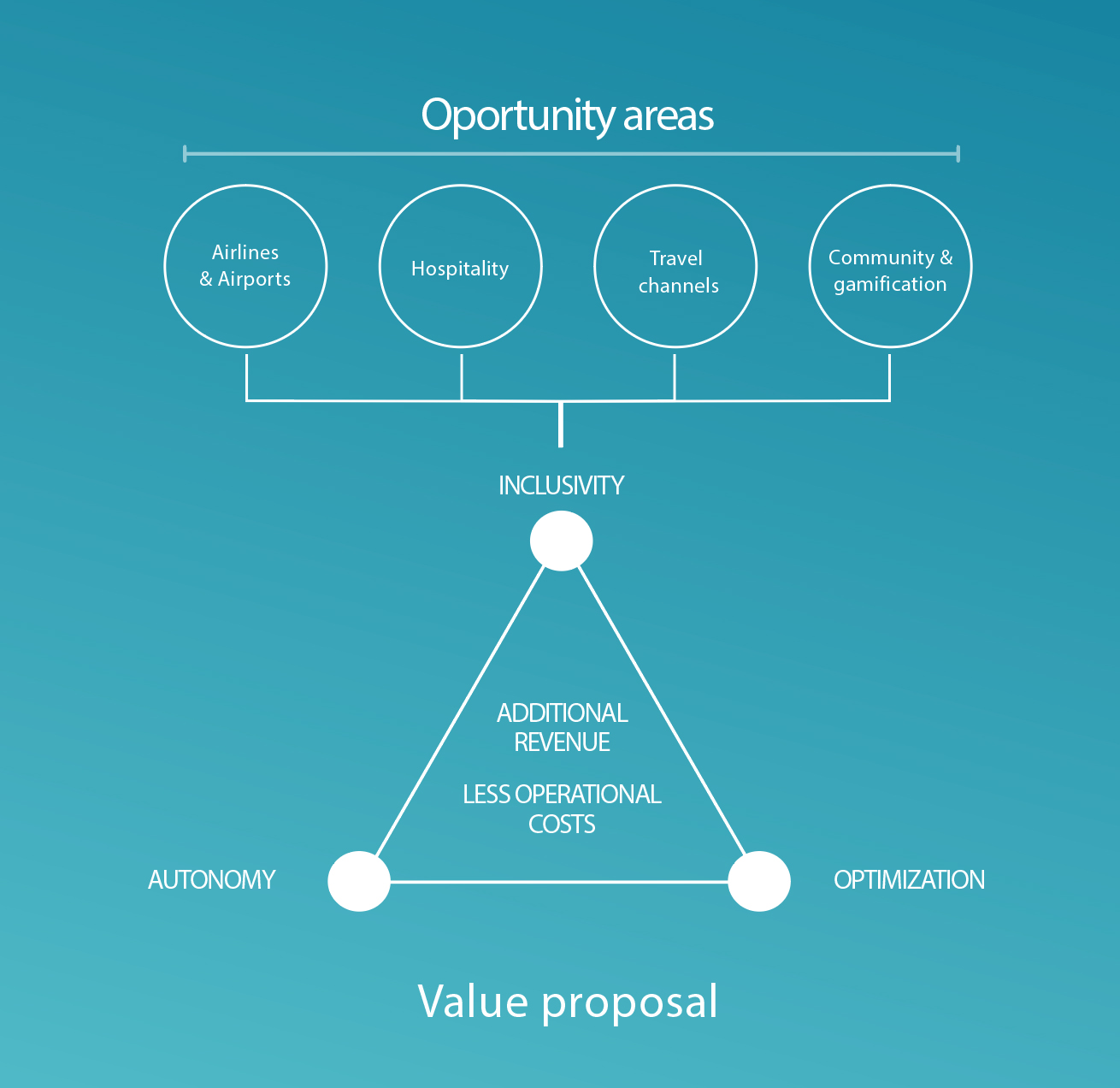 Based on the insights and value proposal identified, there have been 4 opportunities areas identified in Airlines, hospitality, travel channels and, community and gamification. Which lead us to the value proposal focused on three axes of value creation: Inclusivity, Optimization and Autonomy
